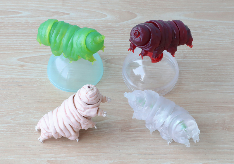 致力於真實打造、介紹擬態植物昆蟲生態的「立體圖鑑」系列,採用1:1比例還原昆蟲的實際大小,並在顏色、姿勢造型和體格構造方面再現擬態昆蟲的生物細節。本次的T-ARTS「原色圖鑑系列番外篇 水熊蟲」,特別將世界最強的緩步動物以放大 10000% 的手掌尺寸再現!共由 21 個零件組合,設計出可動的身軀和小腳腳。分別有一般狀態與伸長口器的補食狀態兩款造型,並有形象色、透明色、透明棕色、透明綠色四種,每款皆附屬展示台座。