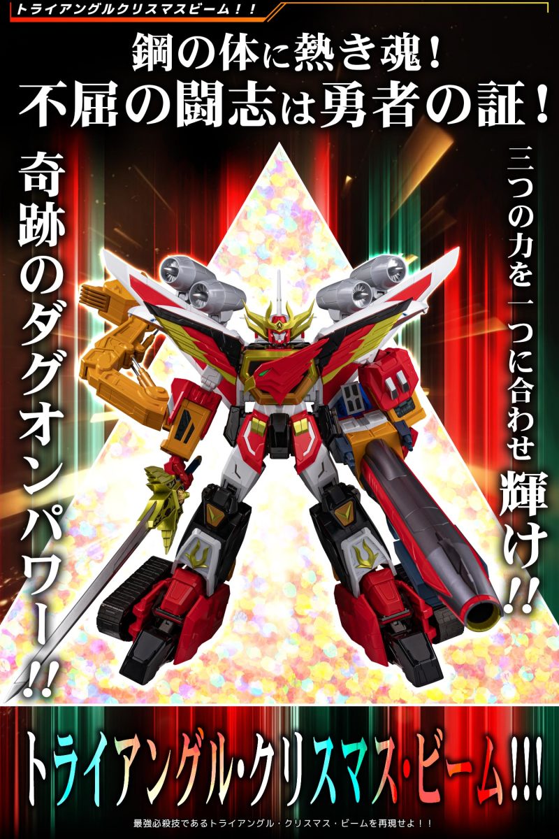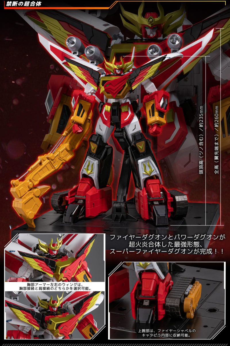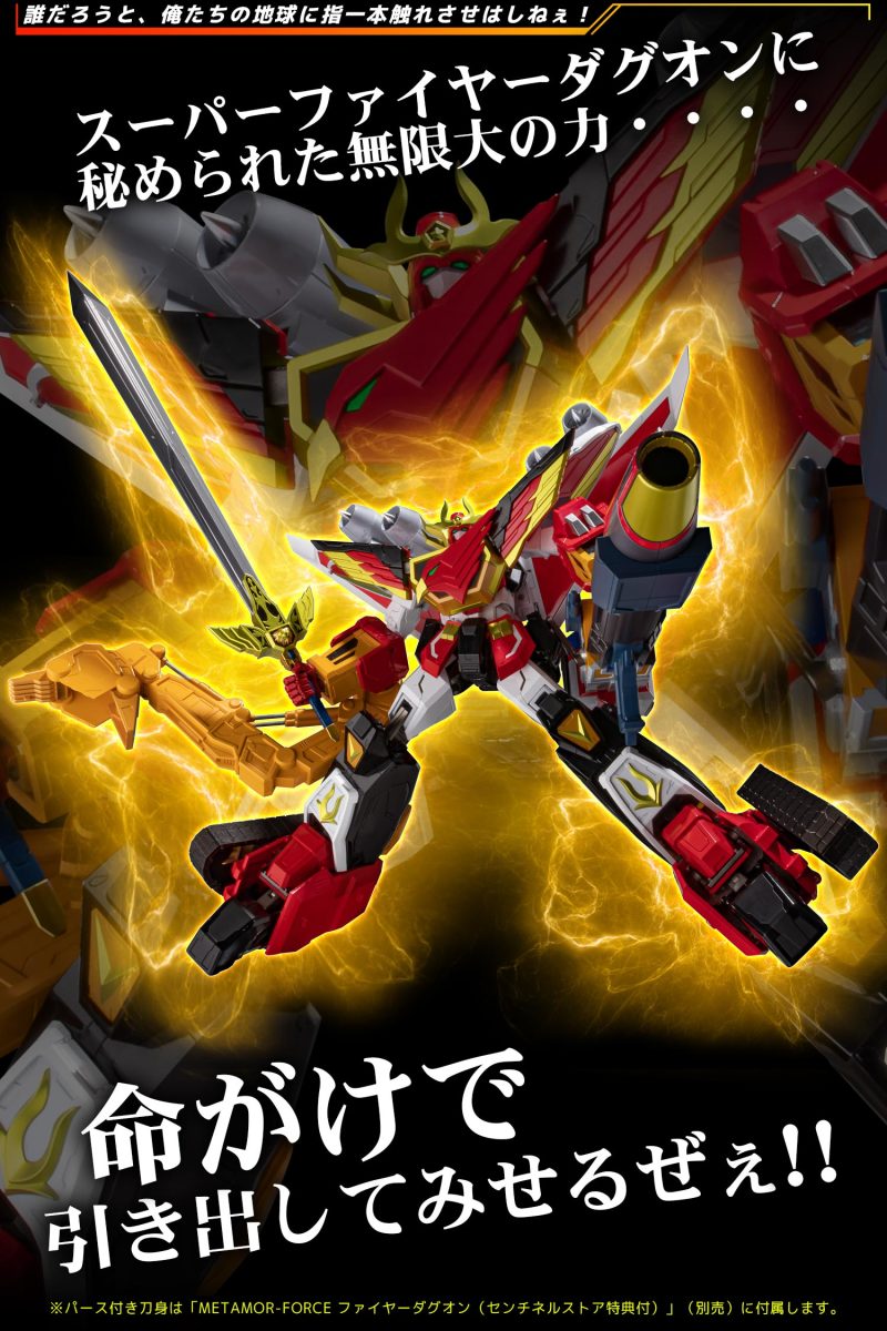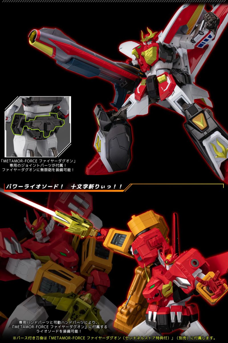 搭配另售的「METAMOR-FORCE 火焰達古王」就能進行超火焰合體組成全高約 26 公分的最強形態「超級火焰達古王」!配件內附全長達 27 公分的武裝「無限砲」,除了能夠直接讓威力達古王裝備外,也能搭配合體後的超級火焰達古王使用,與狂獅劍一同再現最強必殺技「三位一體聖誕光束」!