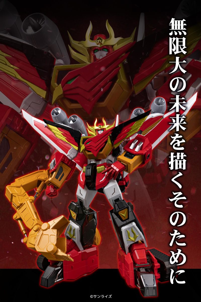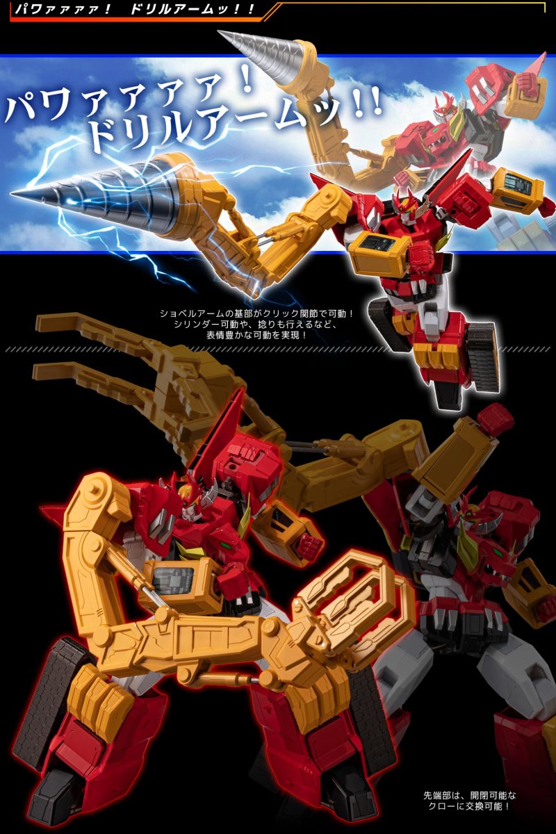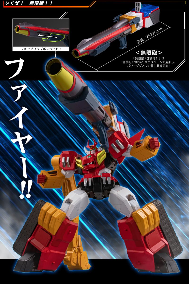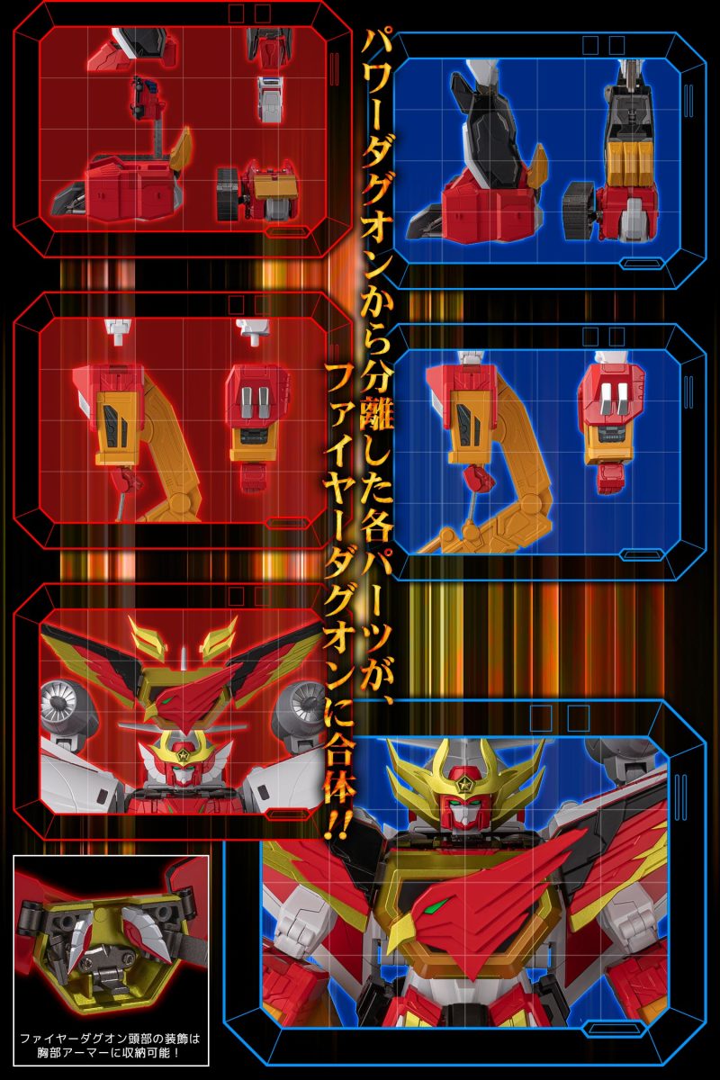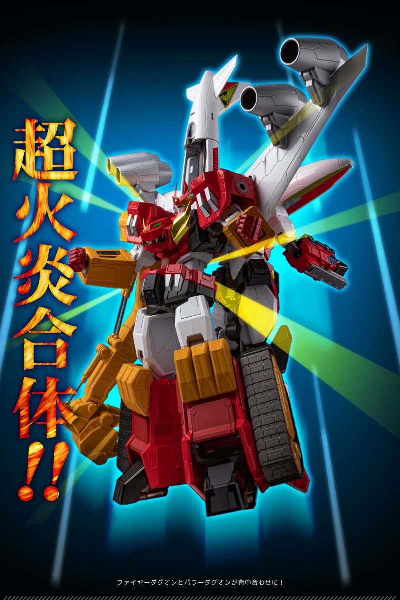 搭配另售的「METAMOR-FORCE 火焰達古王」就能進行超火焰合體組成全高約 26 公分的最強形態「超級火焰達古王」!配件內附全長達 27 公分的武裝「無限砲」,除了能夠直接讓威力達古王裝備外,也能搭配合體後的超級火焰達古王使用,與狂獅劍一同再現最強必殺技「三位一體聖誕光束」!