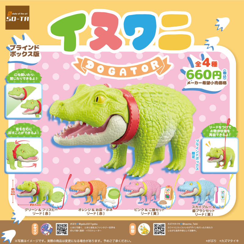 從趣味小物、擬真生物,到與各個原型師進行合作,商品主題相當廣泛的日本玩具廠牌 SO-TA(State of the Art)攜手日本藝術家 がぶり(@gabu0311gabu)與日本造型作家 カズマタイキ(@Kazma_Taiki),共同打造出一款可愛又幽默的轉蛋玩具新作「狗狗鱷魚」(暫譯,イヌワニ)!預計將於 2023 年 8 月發售。