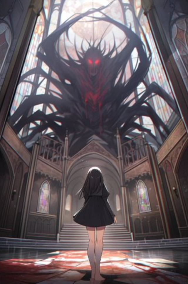當取消在繪圖裡關於「十字架」的指令時,可以看到創作出的繪圖,雖然同樣是在教堂內,卻在天空中出現了看似邪惡的不明物,彷彿少了十字架,就召喚出了不可名狀的邪惡元素,這個差異也讓該網友感到不可思議。