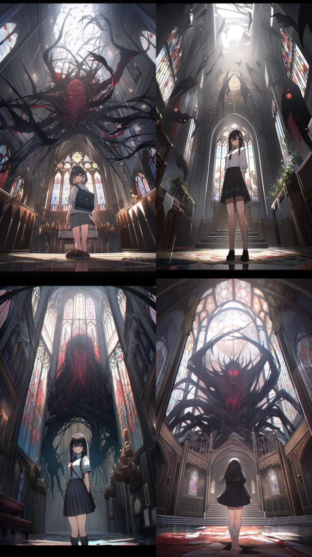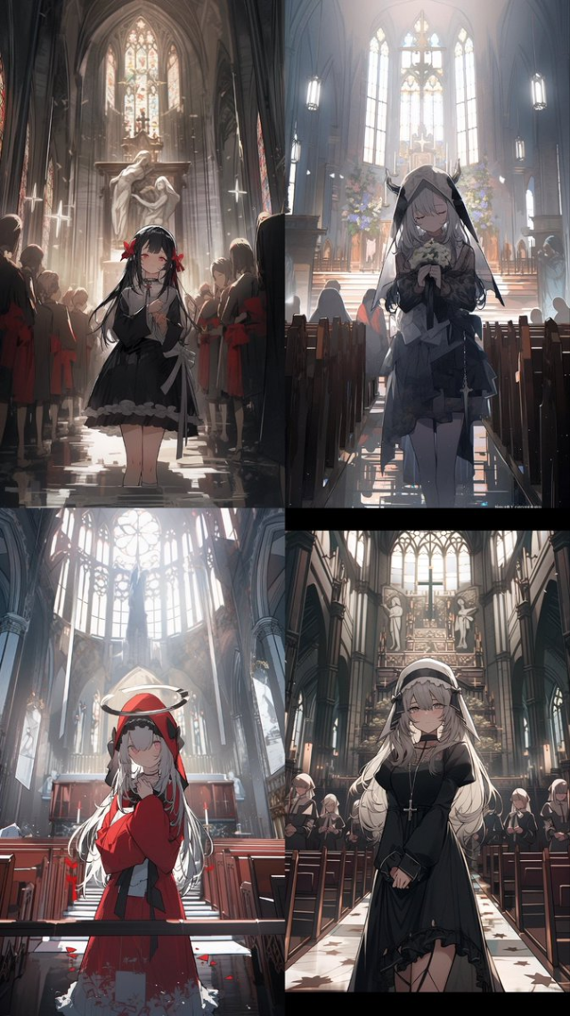 下圖是原先該網友嘗試的 AI 繪圖「教堂祈禱」,看起來的確效果算是滿 OK 的,也都出現祈禱的少女,教堂的格局也很正常。