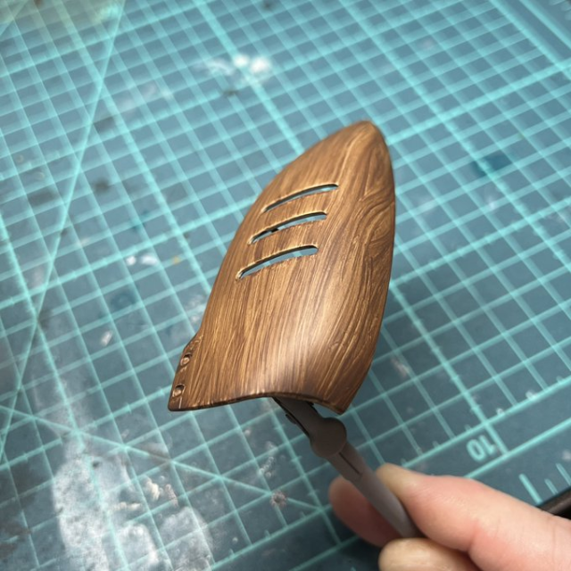 他也表示其實木質塗裝並不會太棘手,但是在木頭紋路的描繪上是必須花上一點苦心的,畢竟要呈現出真實的木頭質感,重點必須放在木紋的一致性,必須讓整體木頭感覺是一體成形的,並且在配色上要和諧才能展現出木頭的質感。