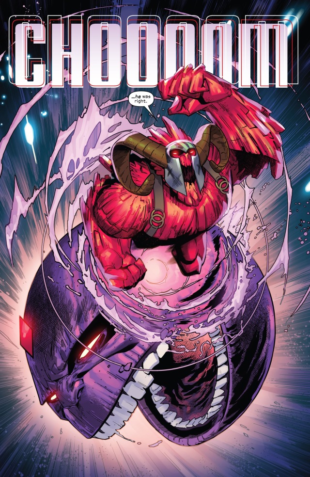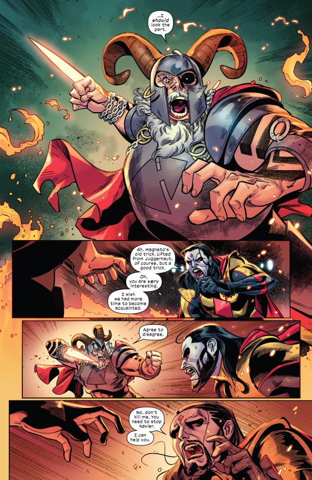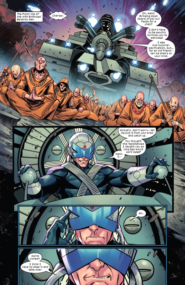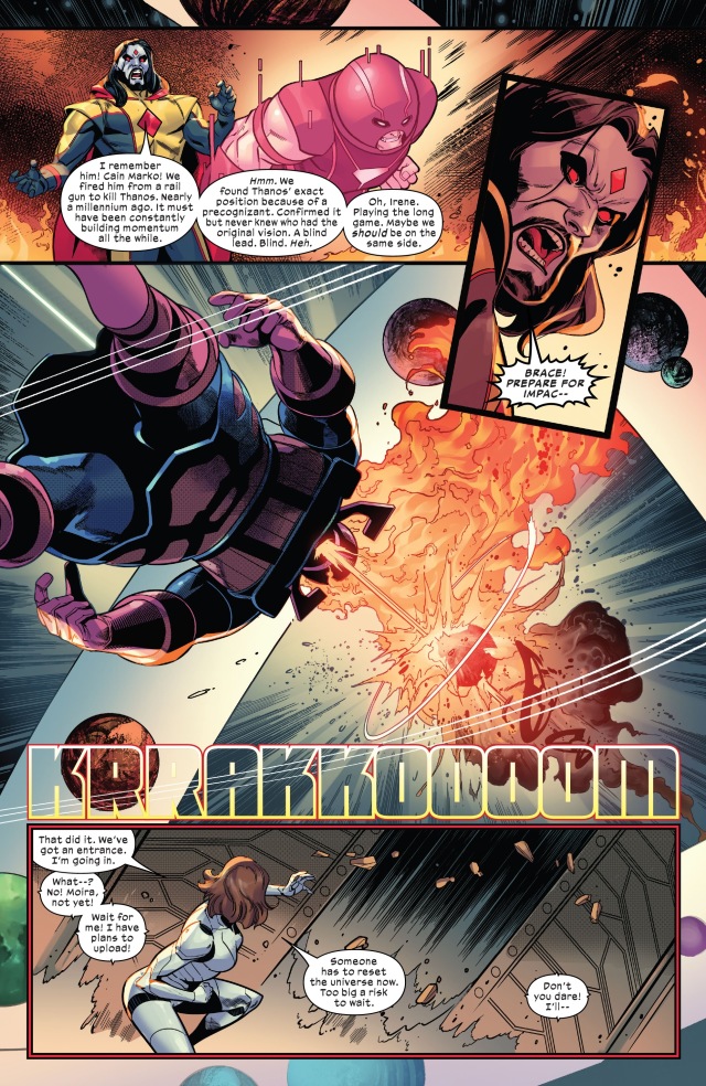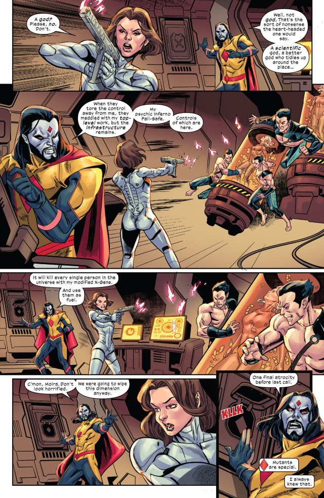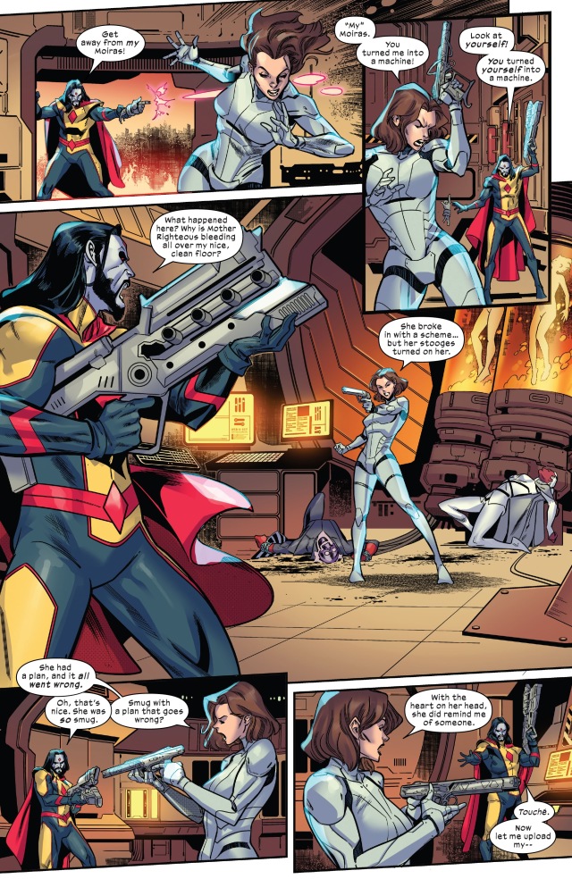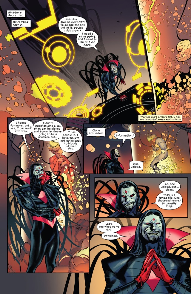 視角首先切回到「主角」凶兆先生(Mr. Sinister)身上。他和莫伊拉(Moira)本尊發現紅坦克(Juggernaut)被命運女(Destiny)設計飛越了千年的時光,好在這一刻能夠飛到此地——暴風星系(Storm System)——以打破凶兆先生的莫伊拉實驗室外的屏障。