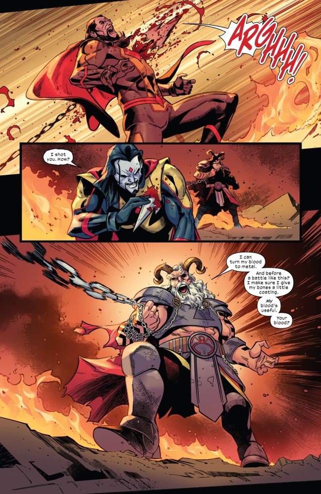 凶兆急著進入實驗室,方才被他從背後槍擊的鋼焰(Ironfire)卻突然爬了起來反擊他!原來鋼焰早就以自己的變種能力在全身的骨頭上都加固了以血液變成的金屬,因此沒有被擊穿腦袋死亡。