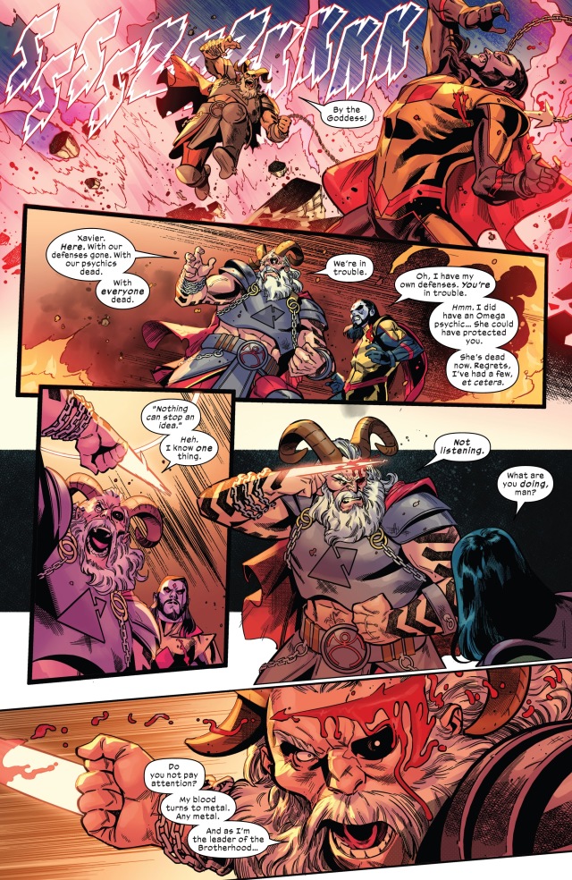 答案是,鋼焰在頭上畫出傷口,將流出來的血液化成了萬磁王的頭盔!作為變種人兄弟會的首領,自然要像樣了。