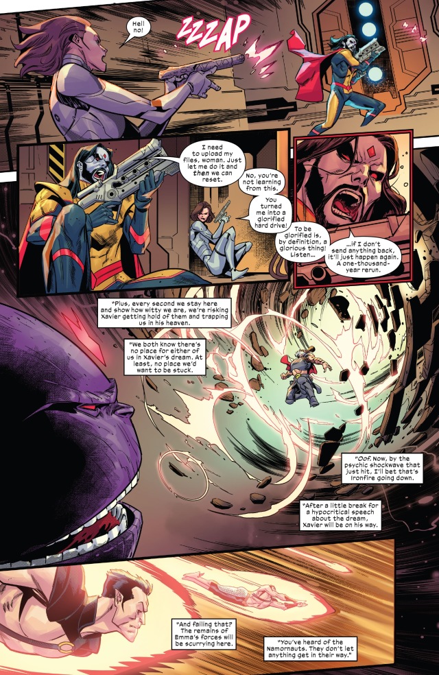 X教授於是將自己的星體給直接傳送到了野獸的星艦上,把整艘船變成了某種可怕的精神兵器,直直衝向暴風星系。