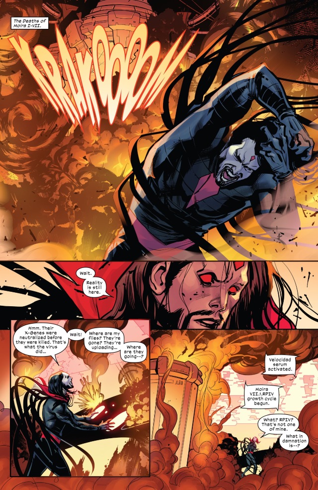病毒隨後便把莫伊拉複製人的X基因給中和掉、並把整個機器給炸了。但是卻突然有一個代號「RPIV」的新的基因組竄了進來開始進行誕生過程!