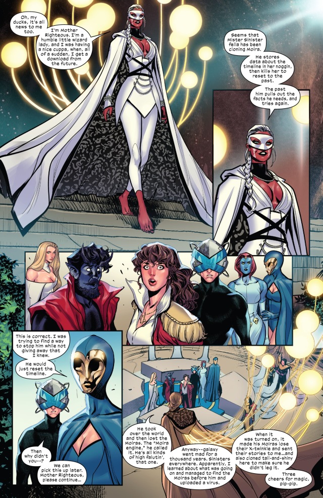 而拉斯普京隨即以將正義主母以救世主的身分介紹出場。根據她的說法,凶兆造出了莫伊拉引擎並用來不斷在時間中跳躍進行實驗,將凶兆變種人散佈到整個宇宙,最後是由她來拯救了一切並將拉斯普京送回來,以確保凶兆被懲罰。