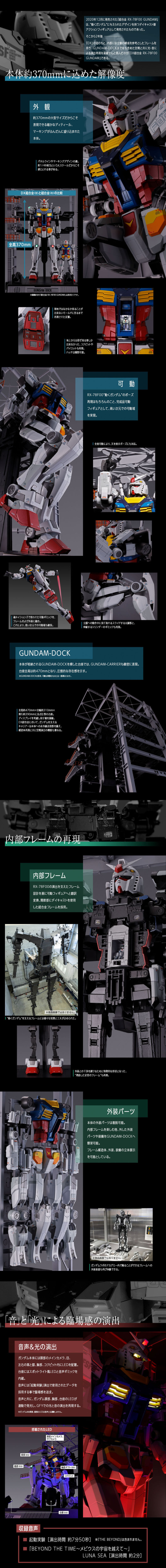 和先前推出過的「超合金 RX-78F00 鋼彈」不同,「DX超合金 RX-78F00 GUNDAM」擁有更加巨大的尺寸與更豪華的聲光演出。這款商品徹底還原橫濱的可動立像,內容包含鋼彈本體與格納庫,光是鋼彈本體全高就達 37 公分,加上格納庫後更有 47 公分高魄力尺寸!