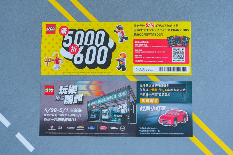 「玩樂關頭」4月28日至5月1日活動期間除闖關成功,即獲得熱門樂高車款貼紙及樂高駕照之外;活動闖關卡集滿三個過關章至三間指定店鋪消費任意盒組,還可以加碼獲得「經典小紅車」。另外活動期間,將於「玩樂關頭」活動現場、樂高授權專賣店 遠東信義A13、鼎美玩具 信義誠品、麗嬰國際 信義新光A8館發放折價券,於5月14日前憑券至三間指定店鋪消費LEGO®TECHNIC、LEGO®SPEED CHAMPIONS、LEGO®CITY滿5000元即可折價600元,機會難得,愛車的玩家千萬不要錯過囉!