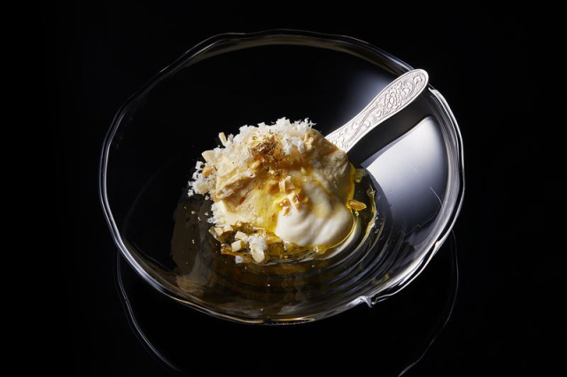 「白夜」是使用過去以200萬日元價格競標的白松露、日本傳統食材酒粕以及帕馬森起司所製成,有著白松露濃厚的香味以及酒粕奢華且甘甜的口感,吃之前再淋上附贈的白松露油能讓香味和口感更上一層級別。