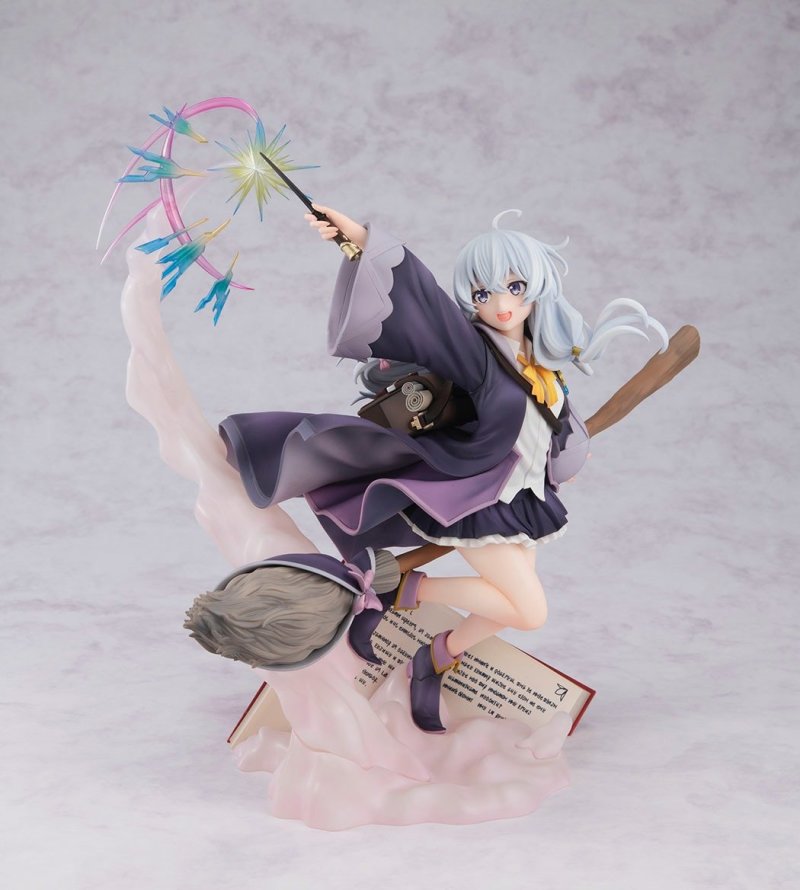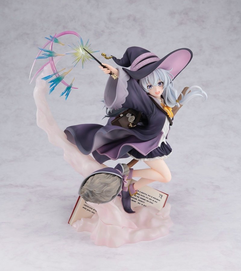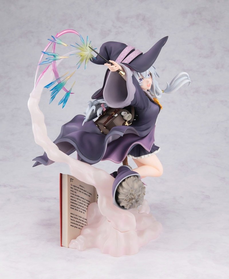 這款由KDcolle所推出的「伊蕾娜~我的冒險譚~」,以1/7的比例實體化,全高約25公分。外型主要是白襯衫搭配短裙,外披魔女造型的長袍,以伊蕾娜身騎掃帚,手持法杖正在施展法力的模樣做為外型基礎,施展法術的特效光芒,還有煙霧也具體還原出來,並且完美地順勢向下,與書本造型的地台合一,搭配伊蕾娜短裙下修長雙腿的躍動感,看起來相當漂亮有質感。身上的髮絲和身背的包包也仔細地還原,另外頭戴的魔女帽可以自由穿脫,拿掉帽子的伊蕾娜更顯可愛。