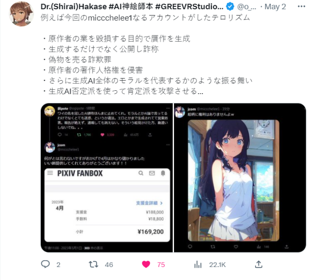 AI 繪圖盛行以來,在網路上也開始出現不少針對 AI 技術的爭議,而當中最大顧慮的,就是關於繪畫盜取的問題,因為已有不肖人士會以繪師的完成品再拿去給 AI 製作新圖,搞得繪畫圈烏煙瘴氣。最近又出現日本繪師在推特抱怨,有人冒用自己的名義發布 AI 圖深受其擾,卻有得利人士跑來留言,引起網友熱議這個奇怪的現象。