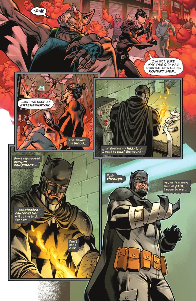 最後蝙蝠俠奮力一搏,在故障保險的裝甲上開了一道小孔,讓奈米機械進去改造它的程式碼,希望可以扭轉局面;但是這仍然沒能阻止它把布魯斯「消滅」。