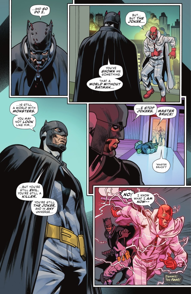 不過那些奈米機械並不是無用功,因為故障保險其實是將布魯斯送進了多元宇宙,讓他來到了一個「沒有蝙蝠俠的高譚市」。雖然小丑(Joker)並不存在,但是這個高譚市還是一樣墮落,而這裡的布魯斯早已死去多時,也從未變成蝙蝠俠。