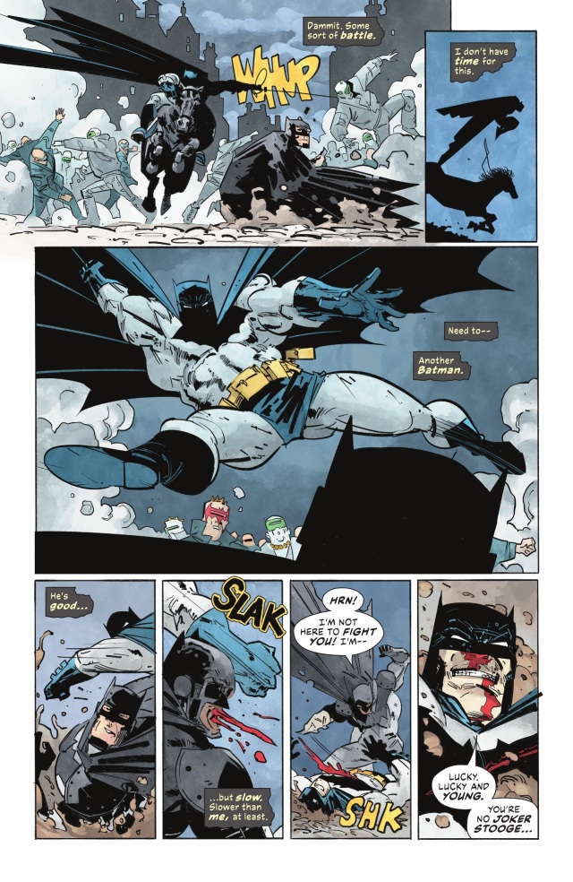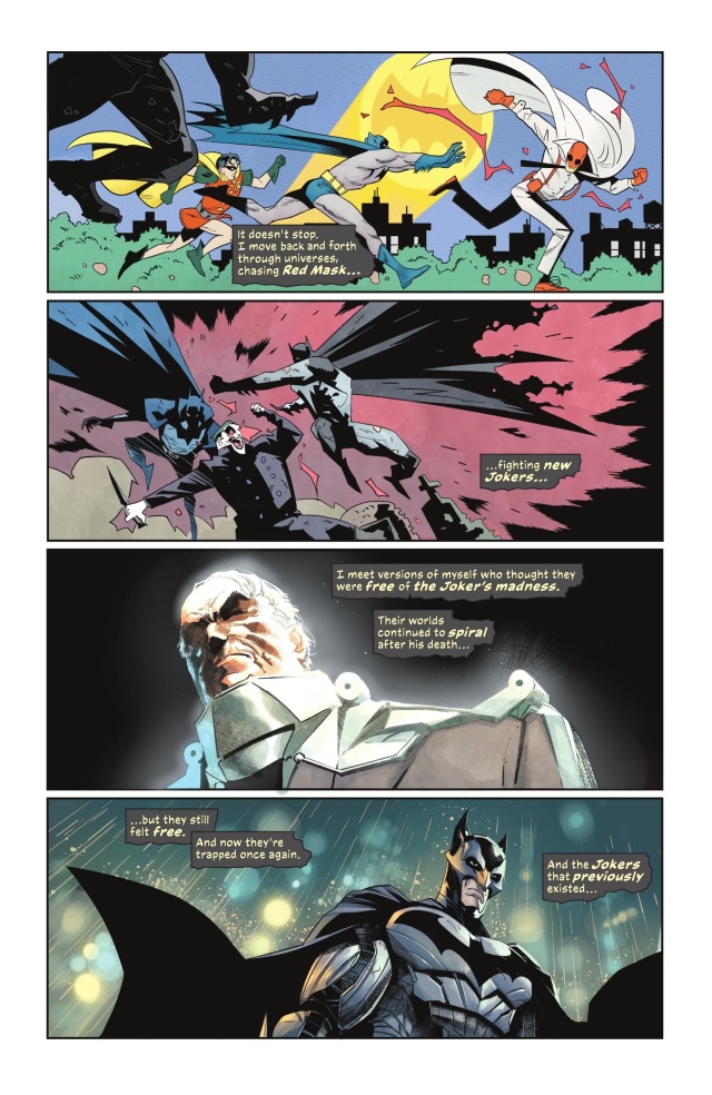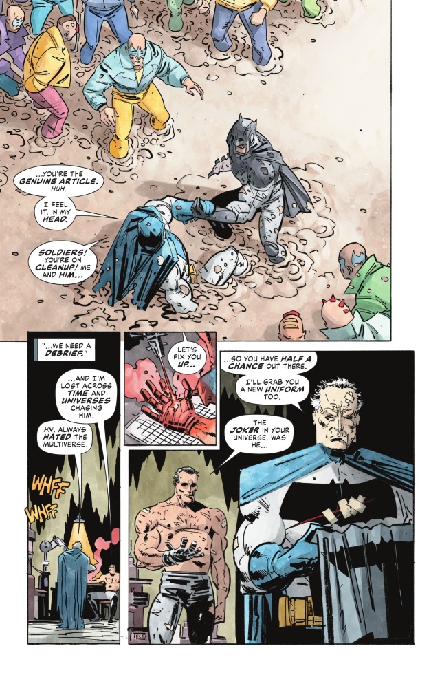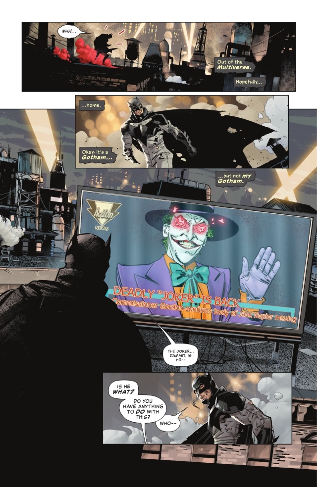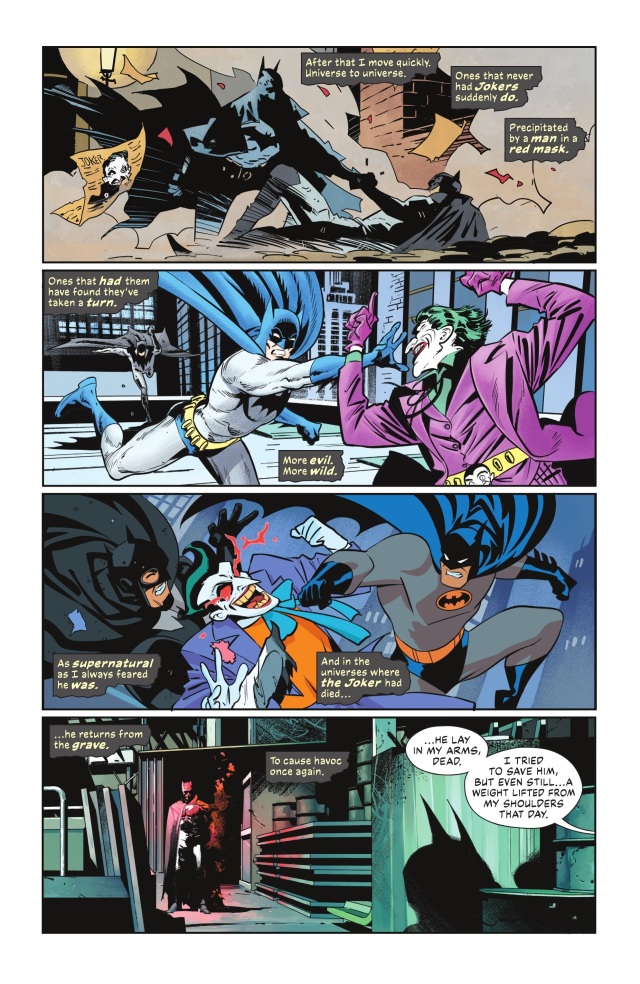 先後經過了《Red Rain》、《煤氣燈下的高譚市》(Gotham by Gaslight)、蝙蝠俠動畫系列等世界,與當地的蝙蝠俠合作對抗突然誕生的、更加凶暴的、死而復生的小丑們之後,他來到了某個同樣有代表性的世界。