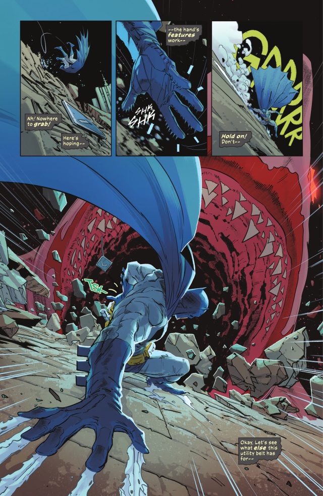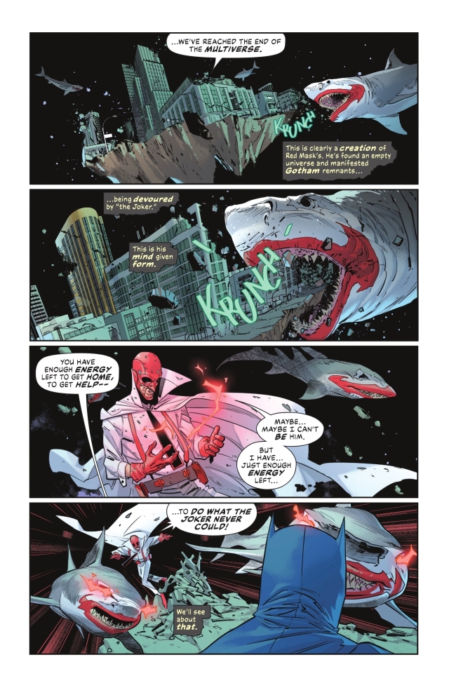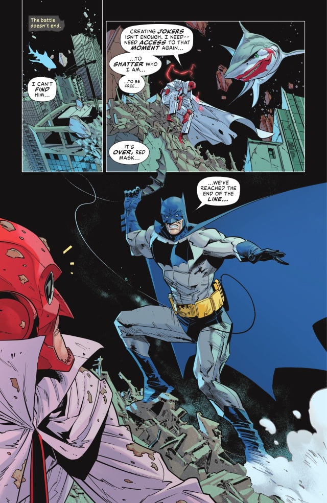 最後,蝙蝠俠終於到達了旅途的盡頭。這裡是紅面具所創造的空間,一座即將被「小丑鯊」吞噬的「高譚市」。而配備了來自不同蝙蝠俠的裝備的縫合怪蝙蝠俠終於趕上了紅面具,可以來場最終決戰!
