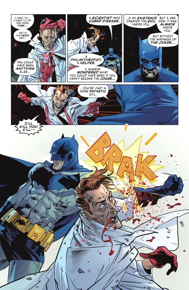 最後只剩下兩人。多年來,布魯斯一直在思考如果不是他,也許小丑不會成為小丑,而是成為治癒癌症的人或是別的什麼偉大的人。