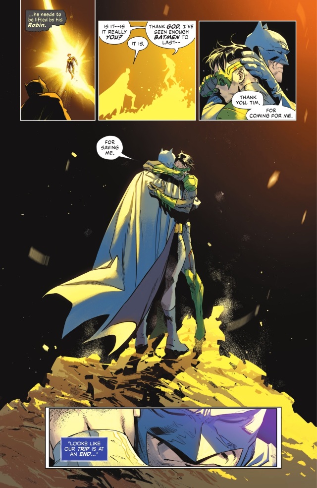 現在,他只能把其中一人送回家,但是他又不能留著Darwin在這邊等死。於是他獨自在黑暗中思考著解決方法,直到這段時間以來一直在尋找著他的三代羅賓提姆‧德雷克(Tim Drake)終於在這奇怪的空間中找到了他,成功把他帶回了家!