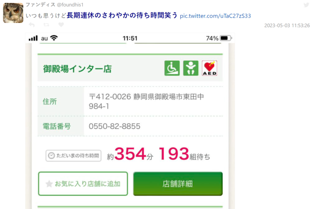 其實連假期間,這種人氣餐廳總是會湧入大量人潮,在台灣也可以發現很多餐廳幾乎都一位難求。而在靜岡縣就算有 34 家分店,在黃金週期間仍是幾乎間間客滿,不少人預約都發現等候超過 5 小時以上,甚至 8 個小時都出現,網友只能自嘲預約完都要吃宵夜了。