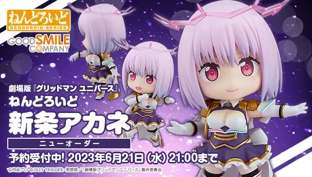 由日本GOOD SMILE COMPANY 發行,旗下種類超過千款的人氣商品「黏土人」 系列,繼「新條茜」後,再度發表了以人氣劇場版動畫《GRIDMAN UNIVERSE》為主題的最新商品「黏土人 新條茜 (New Order)」,參考售價為 7,000 日圓,預計於 2023 年 10 月發售。