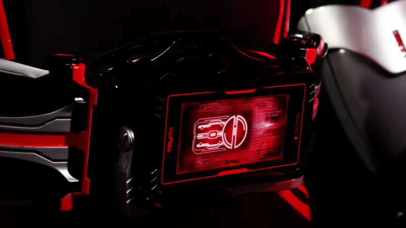 而這次主角乾巧所變身的「假面騎士FAIZ」更獲得全新形態,全身各處依然能看見熟悉的紅色光子血液管線,但包含頭部、胸部、全身裝甲造型都大幅變化。最引人注目的就是腰帶上的變身道具「FAIZ PHONE」也從 20 年前的掀蓋式手機進化成無按鍵的智慧型手機,讓人期待萬代正在開發的玩具會怎麼重現螢幕上的圖樣。