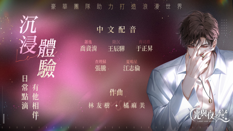 除了事前預約一系列活動之外,為了讓玩家們搶先感受《光與夜之戀》沉浸式的真實感戀愛,宣布從5月16日起展開持續8天的『光影測試』活動。本次測試為刪檔付費測試型態,限定1,000名Andriod玩家透過Google Play參與。在測試期間只要累積8天的登入,就可獲得5星靈犀【齊司禮.永恆花園】,並獲得專屬稱號【皎皎流光】,更能參與【5星靈犀抽獎率提升】及【心願扭蛋機】等多種好康活動。在測試期間儲值付費的玩家,遊戲正式上線後將返還最高200%的等值北極星,讓你在遊戲開局擁有更豐富的資源、更順暢的遊戲體驗。請密切關注後續官方資訊,千萬不要錯過『光影測試』!