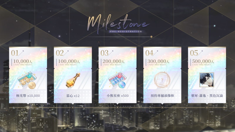 官方為喜愛《光與夜之戀》的玩家們帶來了豐富的預約活動!在事前預約網頁參加「命運時刻」配對活動,即可獲得獨特的虛寶禮包,後續更有神秘驚喜等待玩家,喜歡《光與夜之戀》的玩家一定不能錯過!此外,只要按讚官方粉絲頁,就可以於事前預約網頁獲得「極光幣10,000.初心x6.慕心x3」的大禮包序號!完成雙平台預約後,更能額外獲得「極光幣2,000.初心x6.慕心x3.專屬人脈x1」的加碼禮包序號,序號可於正式上線後在遊戲中兌換。
