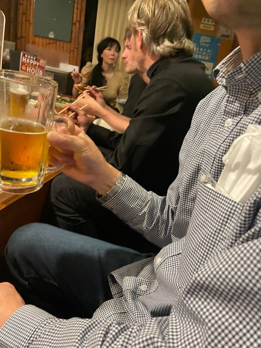 推主自嘲就這麼近的距離,居然坐著一位國際巨星,連自己都嚇到不行,雖然在居酒屋喝酒,但因為這樣想讓自己保持清醒可別喝醉了 www。其實周遭的顧客也都發現這位明星在店內,他也不吝嗇的跟大家問好,也很友善對待意外見到的他的粉絲,展現巨星充滿親和力的待人之道。