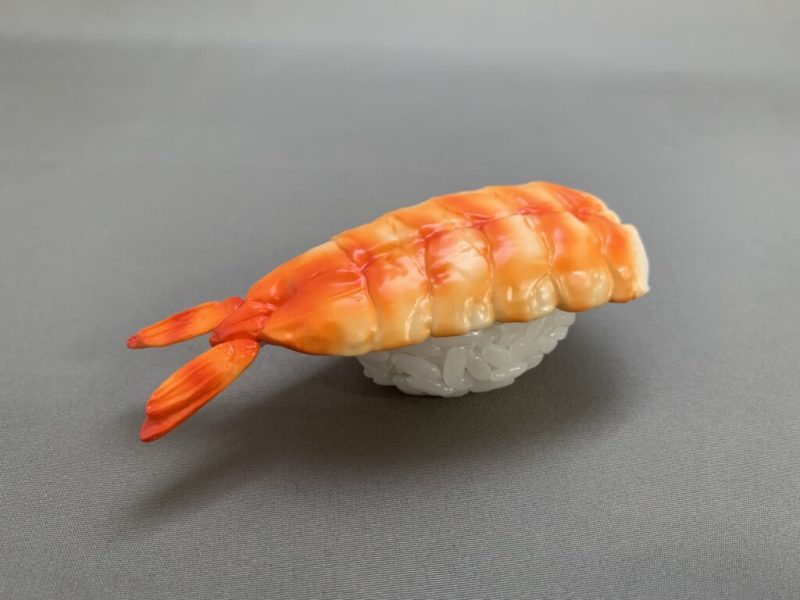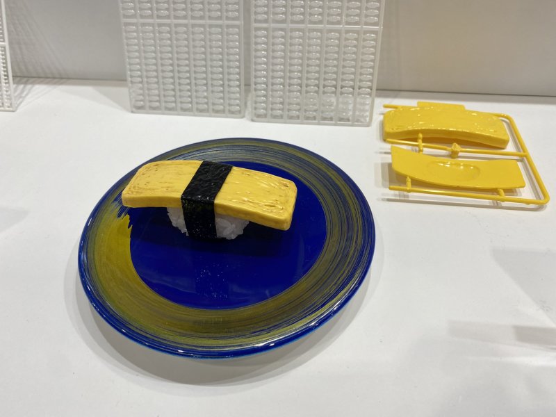 繼「小黃瓜壽司捲ver.」後,壽司模型最新的第五、第六彈分別為「玉子壽司、鮮蝦壽司」,皆採 1/1 比例製作,延續系列風格,使用粘著劑將真實米粒大小的大量醋飯零件黏在一起,並放上食材!玉子與蝦尾使用彩色成型,並在玉子燒的皺褶、蝦子的紋路上都有仔細的刻劃!組出屬於自己的壽司~