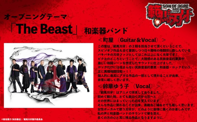 這次讓不少粉絲興奮的,是主題曲 OP 確定由和樂器樂團演唱「The Beast」,主唱鈴華優子也表示非常喜歡《刃牙》作品的世界觀,這次能以動畫主題曲的形式合作非常開心,希望大家會喜歡。
