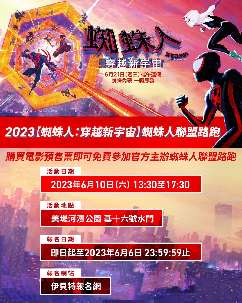 除了虛擬分身之外,粉絲更有機會參與有史以來最龐大的蜘蛛人大集結活動,官方主辦的蜘蛛人聯盟路跑,即將在6月10日(六)在台灣登陸,於台北美堤河濱公園舉辦3K趣味競賽,參賽者只要購買電影預售票即可免費參加,完賽者更可獲得官方獨家蜘蛛人聯盟獎牌。為了鼓勵粉絲扮裝成蜘蛛人宇宙角色一同參與盛會,成為蜘蛛人聯盟中的「台灣蜘蛛人」,於現場登記參加扮裝競賽活動的參賽者,就有機會抽中主辦單位提供的限量電影紀念品。2023【蜘蛛人:穿越新宇宙】蜘蛛人聯盟路跑即將於6月6日(二)截止報名,拯救宇宙的機會稍縱即逝!