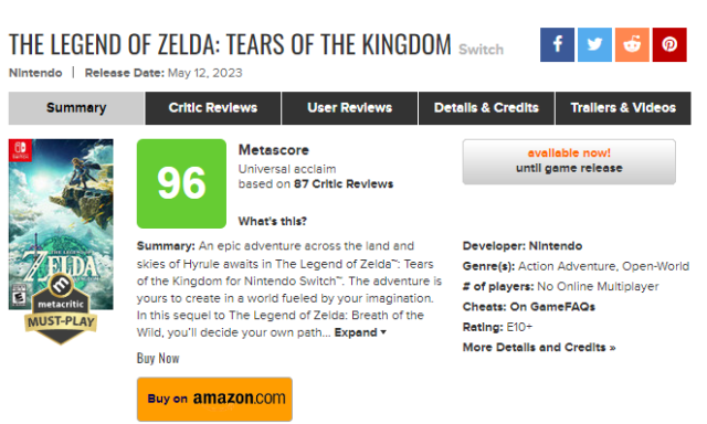 看到Metacritic上的評分,目前《薩爾達傳說 王國之淚》平均是以96分得到相當優秀的成績,其中包含《IGN》、《TheGamer》、《Comicbook.com》、《VGC》、《GameSpot》...等,均給予10/10的滿分評價。