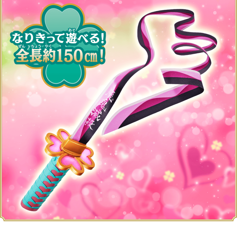 雖是刀劍類型玩具,但以兼具安全與把玩樂趣為賣點的「DX日輪刀~甘露寺蜜璃~」總長度來到 150 公分,再現了「戀柱」甘露寺蜜璃在劇中所使用、刀身輕薄柔軟如鞭的奇特造型,顏色鮮豔的握柄、散發少女氣息的可愛刀鍔也充分還原,在按下位於刀柄的按鈕之後,刀鍔會發光,而在播放聲音之後揮舞這把 DX日輪刀的話則會聽到各種效果音!