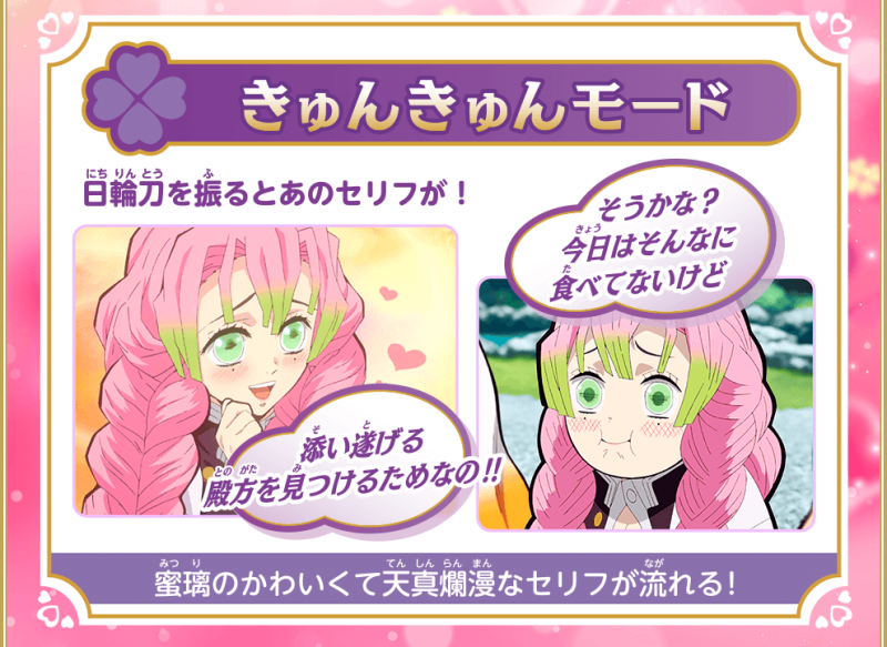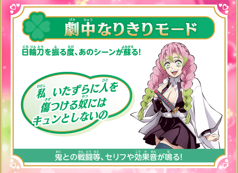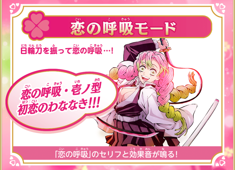 音效部分收錄多達三十種以上!並可以分為「戀之呼吸模式 (恋の呼吸モード) 」、「劇中扮演模式 (劇中なりきりモード) 」、「小鹿亂撞模式 (暫譯,きゅんきゅんモード) 」三種,不僅可以聽到甘露寺蜜璃施展戀之呼吸招式的聲音、劇中台詞、各種音效,就連鬼的台詞也有收錄進來!