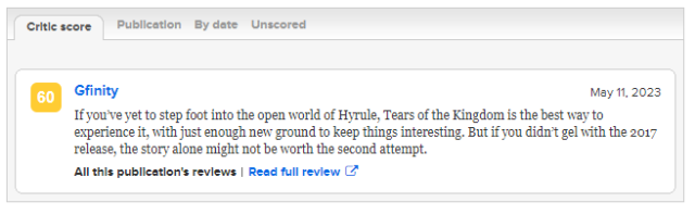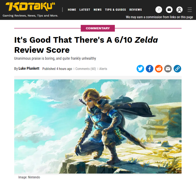 對於這樣的低評價,卻是讓另一知名媒體《Kotaku》,針對《Gfinity》為《薩爾達傳說 王國之淚》給出6/10分數的《Gfinity》這件事,給予相當高的讚賞。