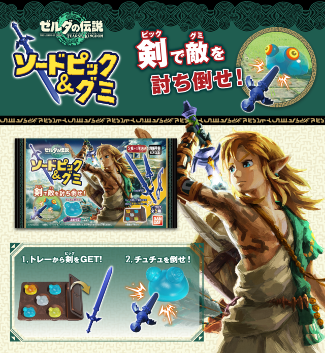 日本BANDAI萬代玩具公司旗下食玩事業部「BANDAICANDY」,常常以各種動漫IP來製作點心零嘴吸引消費者。承襲今天 ( 5/12 ) 眾多玩家期待的《薩爾達傳說 曠野之息》最新續作《薩爾達傳說 王國之淚》(ゼルダの伝説 ティアーズ オブ ザ キングダム) 遊戲發行,推出了最新商品「劍 & 軟糖食玩組合」,以遊戲中五種劍的造型,搭配敵人丘丘 ( チュチュ ) 的外觀設計的軟糖,讓各位能吃又有得玩。售價為 160 日圓,預計將於 2023 年 5 月 15 日正式開賣。