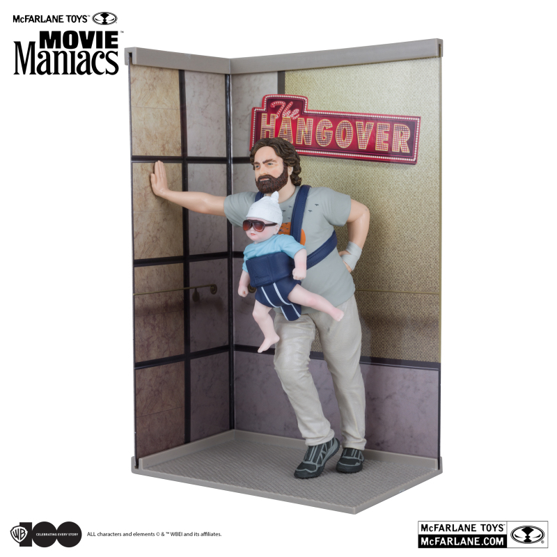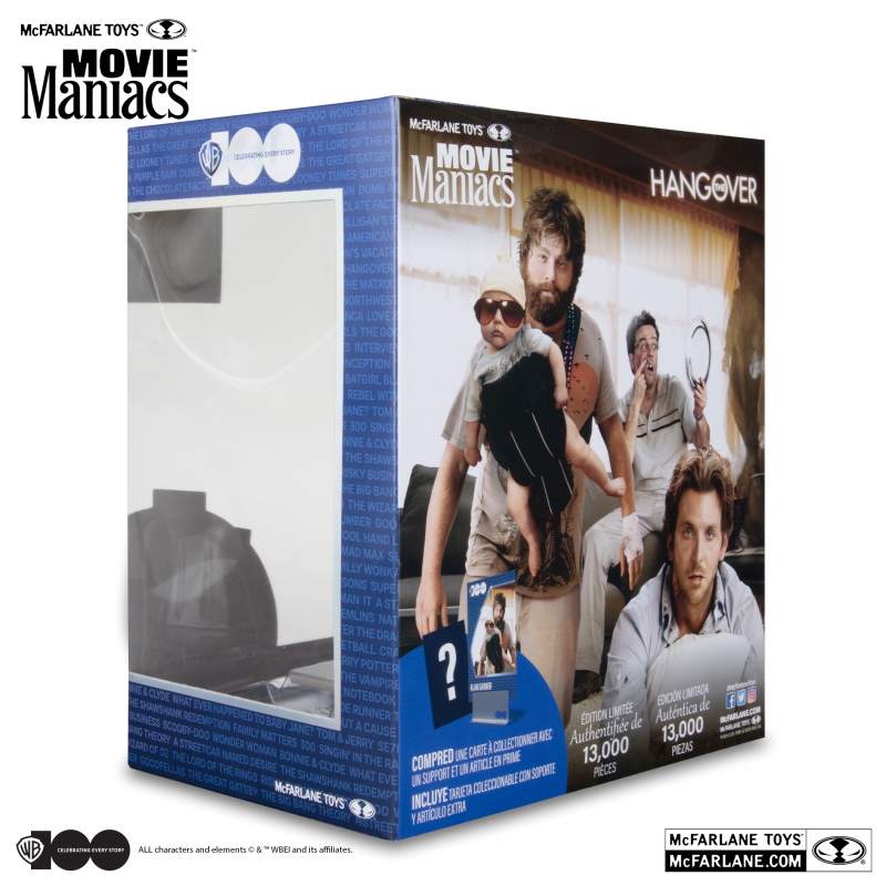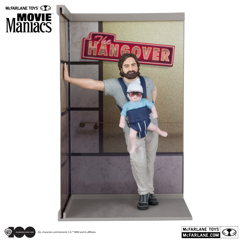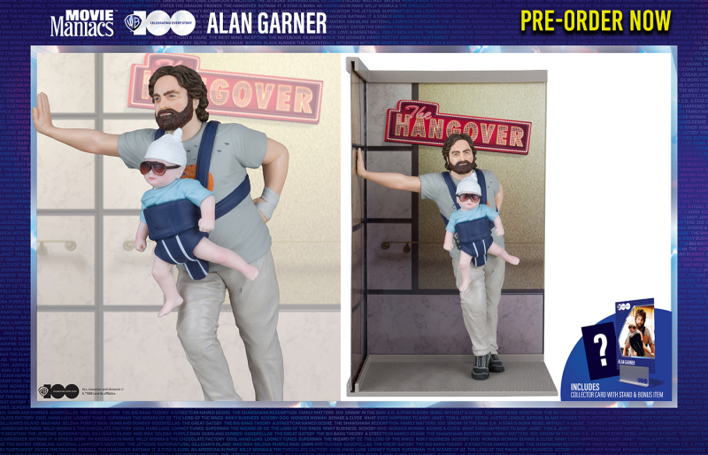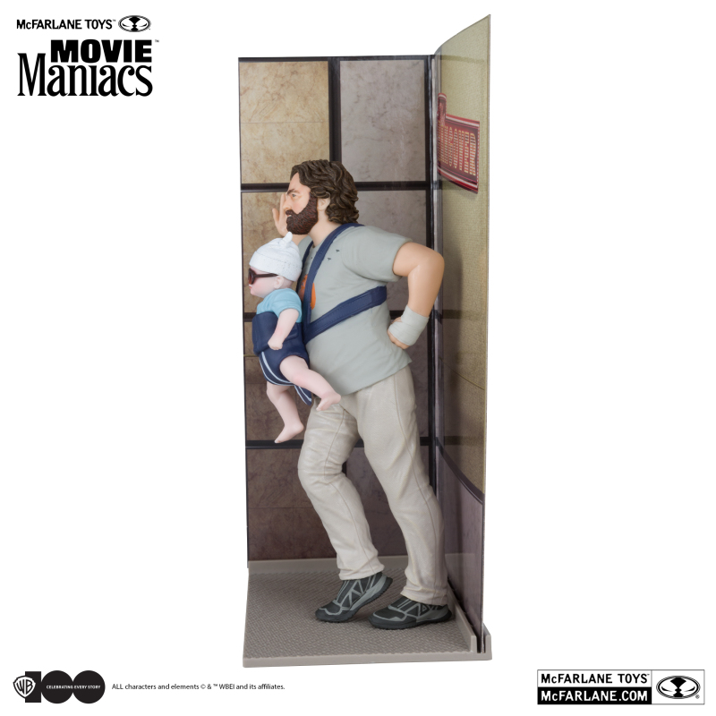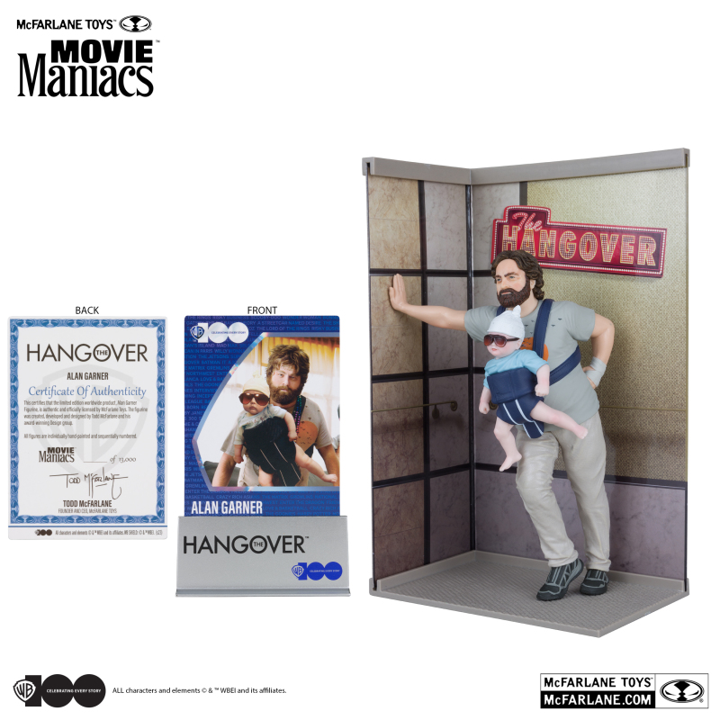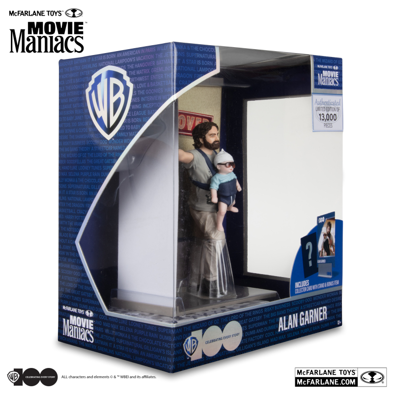 MOVIE MANIACS「艾倫·嘉納」6吋模型,尺寸全高約 15 公分,精緻刻劃出演員查克·葛里芬納奇在戲中飾演艾倫的造型:一臉標誌性的大鬍子、微胖的體型,當然胸前掛著的神秘小BABY更是一大亮點!整體採用在一手插腰一手撐著牆面的姿勢,搭配 WB100 週年紀念的主題櫥窗包裝盒,盒內印有《醉後大丈夫》的電影LOGO,還原電影海報當中荒謬又可愛的模樣~另外還附有一張真品證書的藝術卡及驚喜小卡。