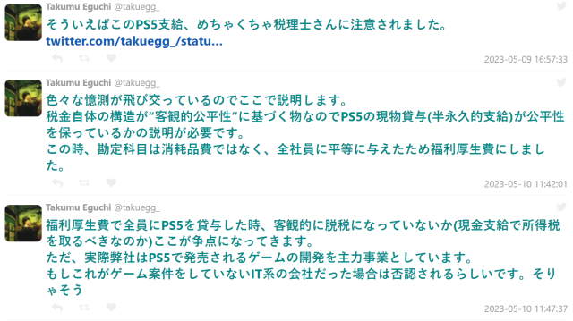 不過在最近,該公司老闆在推特發文表示,因為這個 PS5 贈送給員工的關係,被會計師關切了。其實是因為贈送會有稅務問題 ( 把 PS5 給大家用於福利支出時,客觀上是否逃漏稅問題 )。這時候記賬的項目不是消耗品,而是「員工福利費」,因為它是平分給所有員工的。