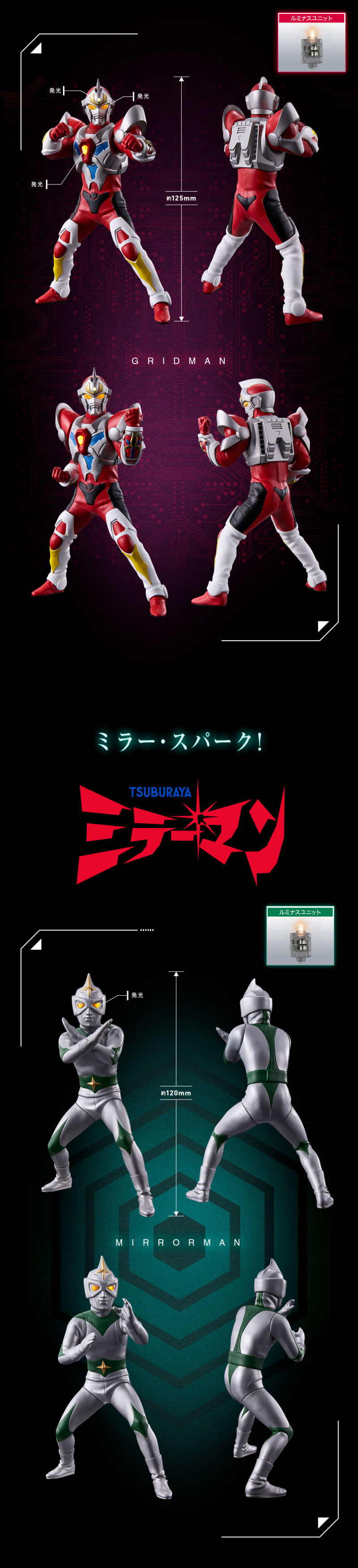 「ULTIMATE LUMINOUS 圓谷PRO 超人」收錄有電光超人古立特和鏡子超人兩大圓谷英雄,在高約 12 公分的尺寸下精巧再現劇中戲服造型與招牌的戰鬥架勢,並附有替換手勢零件,能夠賞玩必殺技姿勢!更在小巧的軀體內部設置 LED 燈發光機構,除了可以讓頭部的眼睛發光之外,古立特的額頭及胸前裝置也能點亮!