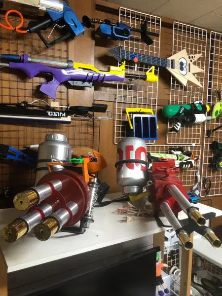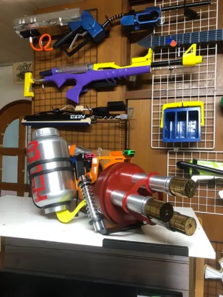 大概從 2019 年開始製作,隨著作品越來越多,他也越來越有心得,製作的成品質感可說是日漸進步。除了外觀外,更是要能真的拿起來配合 joycon 玩遊戲,在配置跟平衡上他也下足苦心,現在家裡有一堆武器可以真的拿來玩,活像一個彈藥庫 XD。