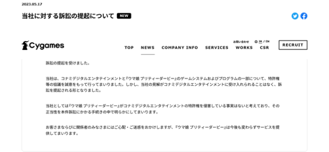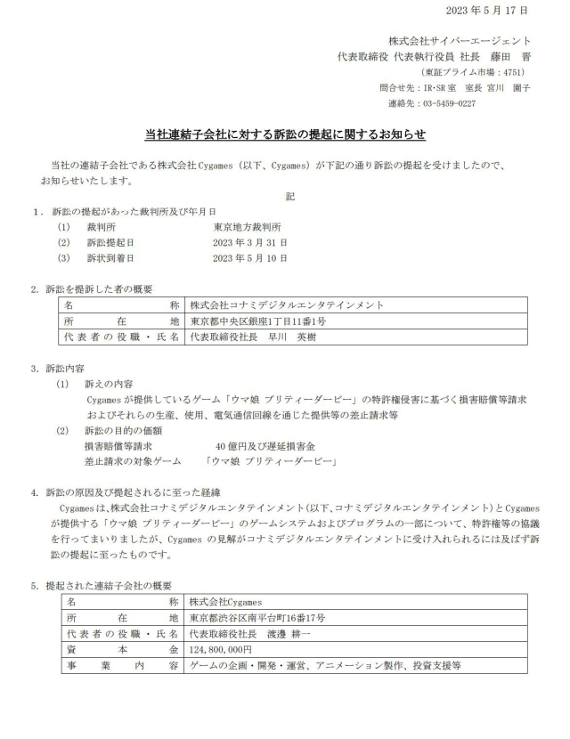 KONAMI 向 Cygames 請求 40 億日幣跟其他相關費用賠償,並要求終止《賽馬娘Pretty Derby》遊戲營運。當然 Cygames 並不認同,強調沒有侵害專利權。