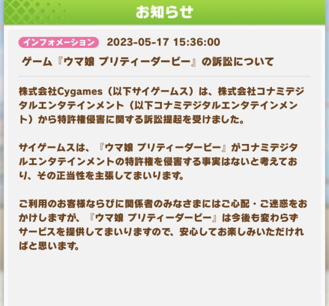 目前 Cygames 的官方也已貼出公告,兩方針對遊戲專利問題並沒有有效解決歧見,對此 KONAMI 這方已在三月底向東京法院提交訴訟程序,主要是針對遊戲 UI 的部分 KONAMI 方認為其持有專利項目,認為《賽馬娘Pretty Derby》侵害他們的特許專利,但 Cygames 方並不認為如此,目前已走向法律途徑,但目前遊戲確定仍會繼續提供服務。