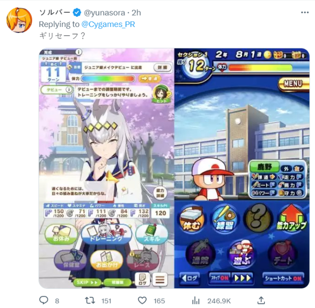 那麼問題到底在哪裡呢 ? 日本網友整理表示是《實況野球》手遊與《賽馬娘Pretty Derby》 的遊戲 UI 太過類似,甚至期間限定活動的介面都與之相去不遠,而 KONAMI 這邊宣稱有申請相關專利,這方面可能對 Cygames 來說相當不利。