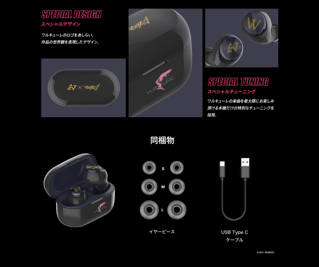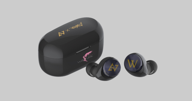 外型上充電盒有著品牌與作品聯名的圖案外,還有本作少女音樂組合「Walküre」的 Logo,在入耳式耳機上可以看到分別以「W」與 AVIOT 的 Logo在上面。