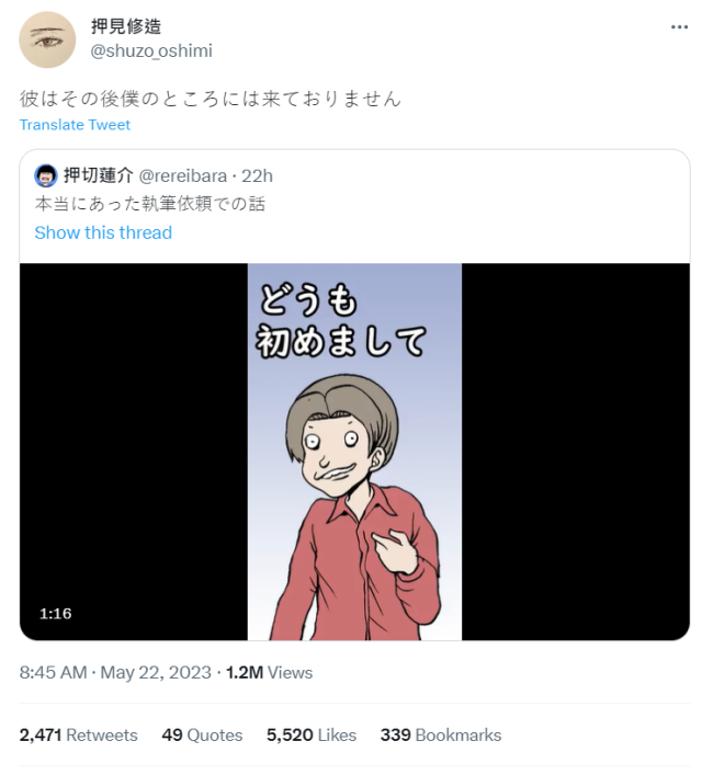 後續押見修造老師也轉推這則推文,還表示在之後這個編輯後來也沒來找他 XD,看來真的是...炒魷魚了嗎 ( ? )