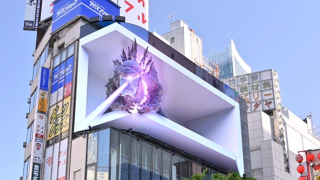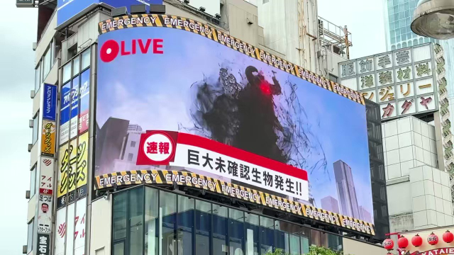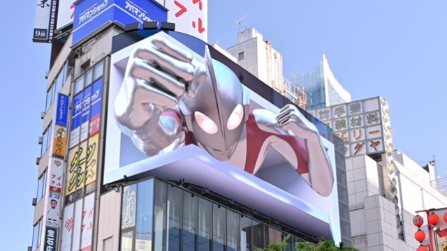 「Cross新宿Vision」放出的廣告一直都很有趣,總能讓路人們停下腳步觀看,而「新‧日本英雄宇宙」的3D宣傳廣告當然也很帥氣,從畫面一開始提示出「巨大未確認生物」的警報後就陸續切換讓四大主角登場,哥吉拉的原子吐息、超人力霸王的必殺光束、初號機的機槍掃射以及假面騎士1號的騎士踢。每個主角都使出絕技將未確認生命體給擊敗,為日本帶來了和平。