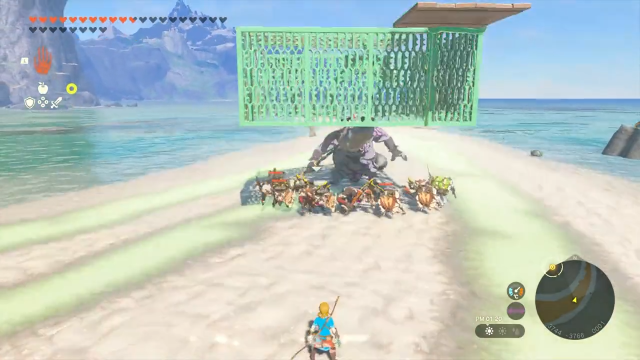 但也不是框住就完事了,可以看到在籠子內的頂部,還有一台專門來無情掃射的砲彈裝置,而我們的災厄...(?),對不起,是海拉魯英雄「林克」,就站在台上,靜靜地看著籠子裡的怪一隻一隻被射殺。