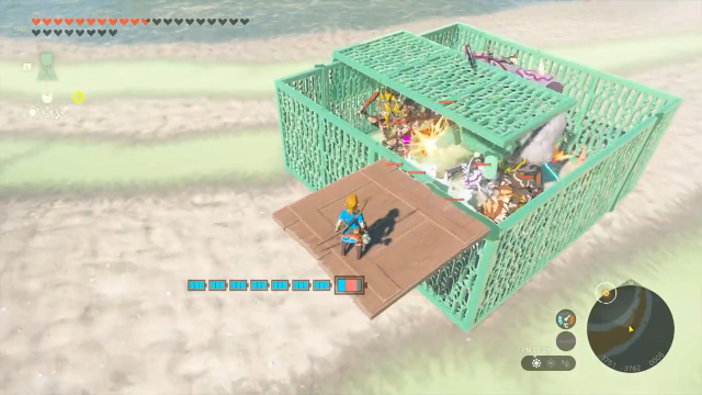 我說,這樣的玩法真的沒問題嗎?雖然到目前為止,我們也看過各個玩家做過那麼多千奇百怪,宛若掀起工業革命還是二戰那種軍事武器啊、載具之類的,但是把人家框起來打也太不講武德了吧!林克你這個卑鄙的外鄉人!(X